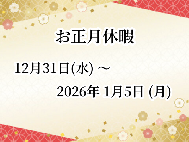 2025年12月31日(水)~ 2026年1月5日(月)まで お正月休暇をいただきます 尚、1月6日(火)は通常通り営業致します よろしくお願いいたします